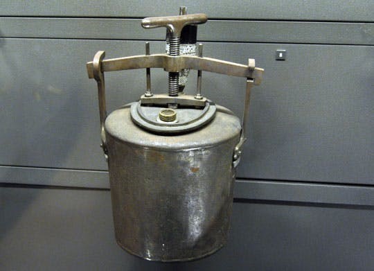 En af de tidligste prototyper af Papin’s trykkoger fra 1679, som kan ses på Musée des Arts et Métiers i Paris. Ikke en model jeg har lyst til at prøve.